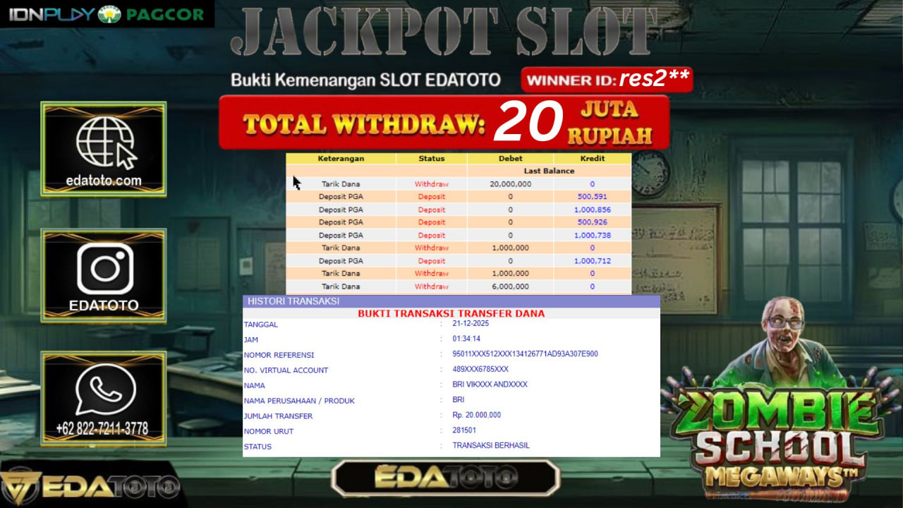 Selamat Kepada Pemilik user ID : res2** Hari/Tanggal :kamis/ 21, Desember 2025 Jackpot : Rp. 20,000,000 JT Withdraw : 20,000,000 . . .