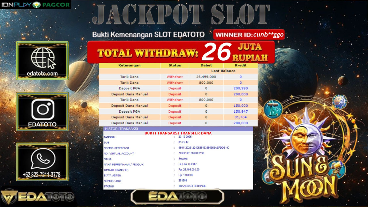Selamat Kepada Pemilik user ID : cunb**ggo Hari/Tanggal :kamis/ 23, Desember 2025 Jackpot : Rp. 26,499,000 JT Withdraw : 26,499,000 . . .
