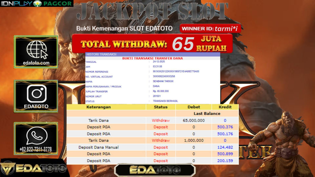 Selamat Kepada Pemilik user ID : tarmi*i Hari/Tanggal :kamis/ 24, Desember 2025 Jackpot : Rp. 65,000,000 JT Withdraw : 65,000,000 . . .