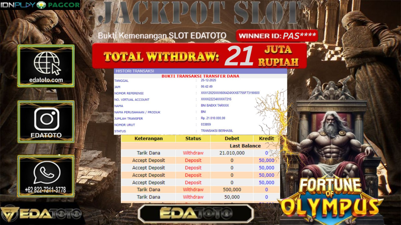 Selamat Kepada Pemilik user ID :PAS**** Hari/Tanggal :kamis/ 25, Desember 2025 Jackpot : Rp. 21,010,000 JT Withdraw : 21,010,000 JT . . .