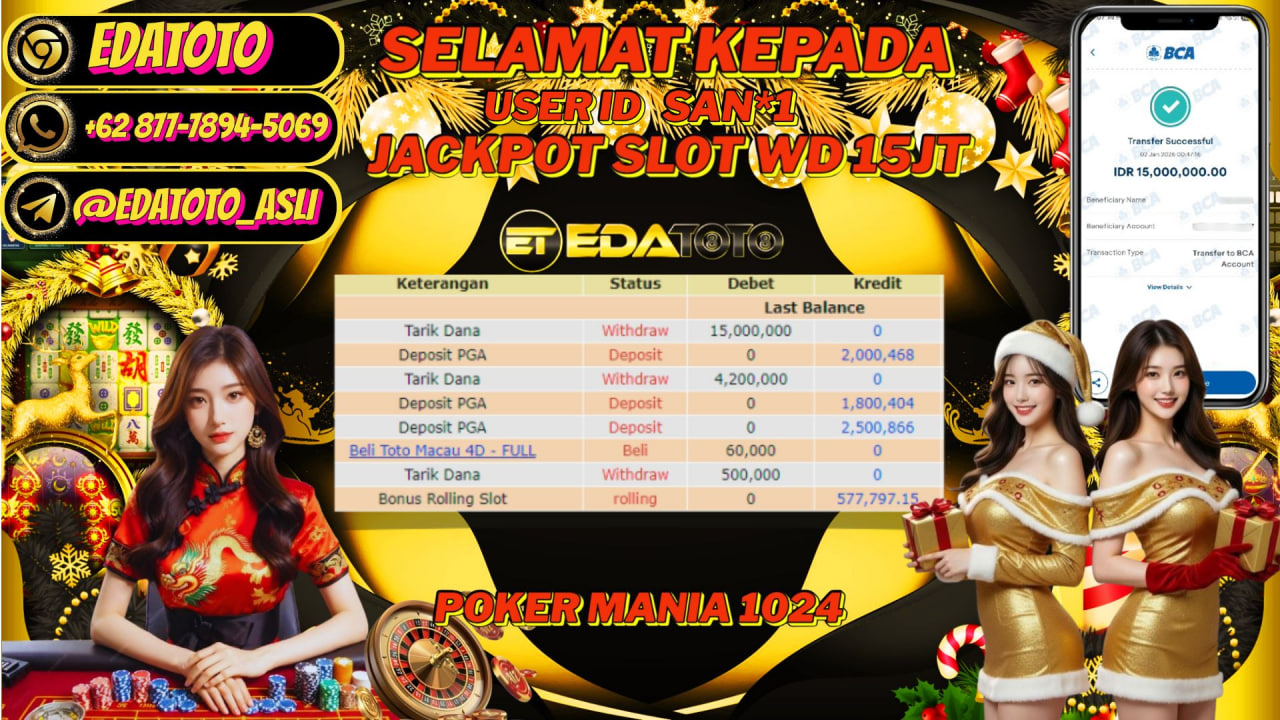 Selamat Kepada Pemilik user ID : SAN*1 Hari/Tanggal :kamis/ 1, Januari 2026 Jackpot : Rp. 15,000,000 JT Withdraw : . . .