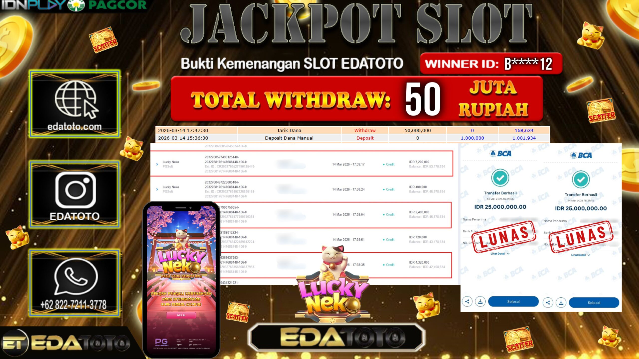 Selamat Kepada Pemilik user ID :S*****D Hari/Tanggal : Kamis / 12 MARET 2026 Jackpot : Rp, 25,012,750 JT Withdraw : . . .